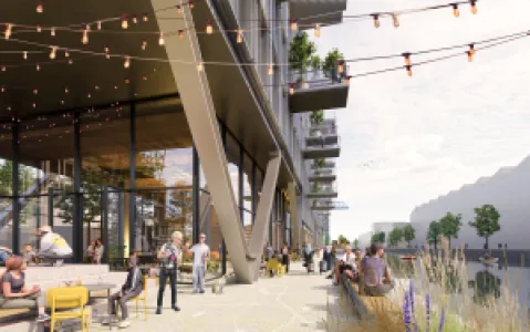 GRAFT's plans for developer Trockland include an urban ensemble of three new mixed-use buildings, attractive outdoor spaces, and a publicly accessible promenade along the canal.