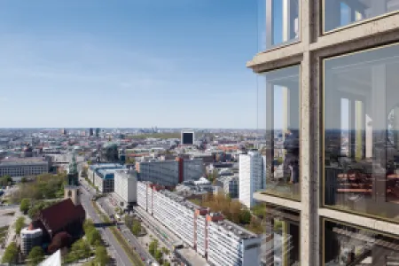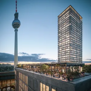 The department store "Galeria Kaufhof" at Alexanderplatz, planned and realised in 2004-2006 according to plans by Kleihues + Kleihues, is to be supplemented by a 146m high high-rise tower and an 8-storey extension of the existing building. The uses are independent of each other and are largely accessed separately. The high demands on inner flexibility and general sustainability are taken into account in the planning – they range from a smart façade to weight-saving cap ceilings.