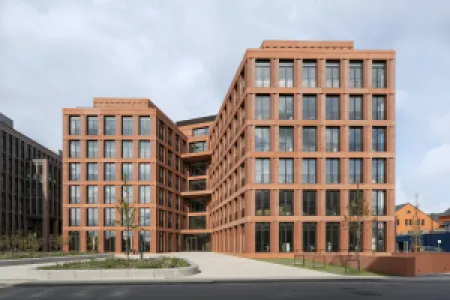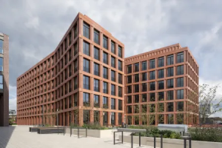The port area in Münster is the most important urban development area and the city’s most attractive new attraction. A harbour quarter is being created here, in which modern architectural solitaires come together to form a lively ensemble. The expressive structure for Fiege Logistik and its partners creates a spatial link with its direct surroundings and, with its building wings, welcomes visitors and users of the building with an inviting gesture. The origin of the linking of trade routes, the intersection, is the guiding principle of the new logistics centre. This guiding principle is not only reflected in the shape of the building, but also in the development core, and enables a large number of links between different spatial units, both horizontally and vertically.